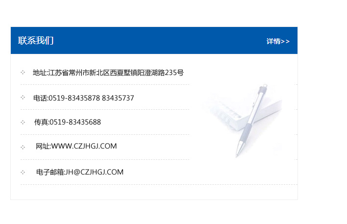 地址:常州市新北區友邦商務大廈1幢16、17層  電話:0519-85101652  傳真:0519-85112595  郵編:213022  網址:www.cz-jiayue_cn.htgwy.com  郵箱:xiajifengaa@163.com